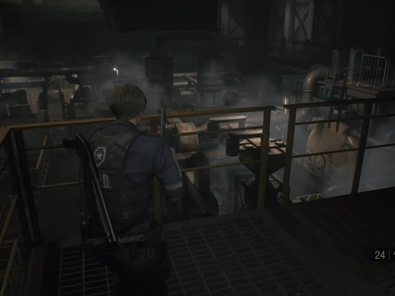 이 시점에서 돌연변이는 괴로워하다 난간 뒤로 떨어집니다. 난간을 확인하던 레온은 이때 사다리가 내려오는 소리를 듣습니다. 이에 레온은 누군가가 지켜보고 있음을 깨닫게 됩니다. 사다리에 오르기 전에 기계실에 있는 약초와 핸드건 탄약 등을 입수합니다.