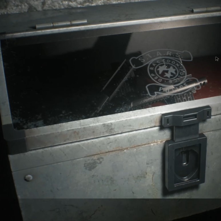 비밀의 방에서는 화약, 산탄총 외피를 입수할 수 있고, 타자기와 아이템 박스가 있습니다. 방을 나가면 엘리베이터를 타고 아래로 내려갈 수 있습니다.