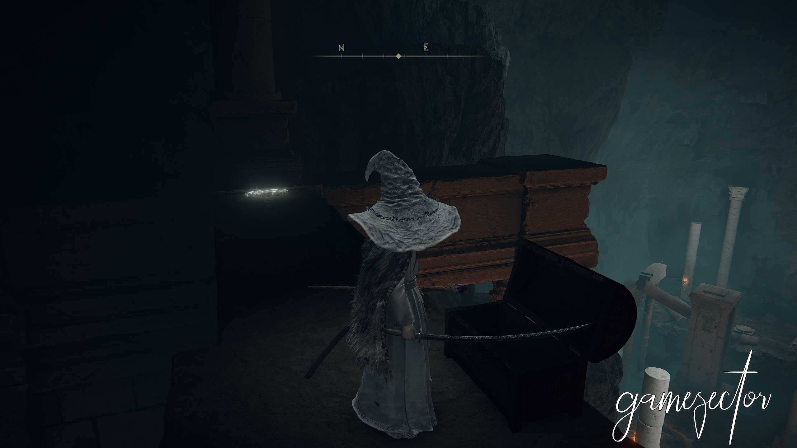 바로 앞에 있는 관을 통해 작은 라니를 얻을 수 있고 너머로는 축복이 보인다. 남쪽으로 진행하면 진흙 인간이 있고 주변에는 은색 반딧불을 얻을 수 있다. 사체를 조사하여 황금 룬과 인골 조각 등을 챙기자.