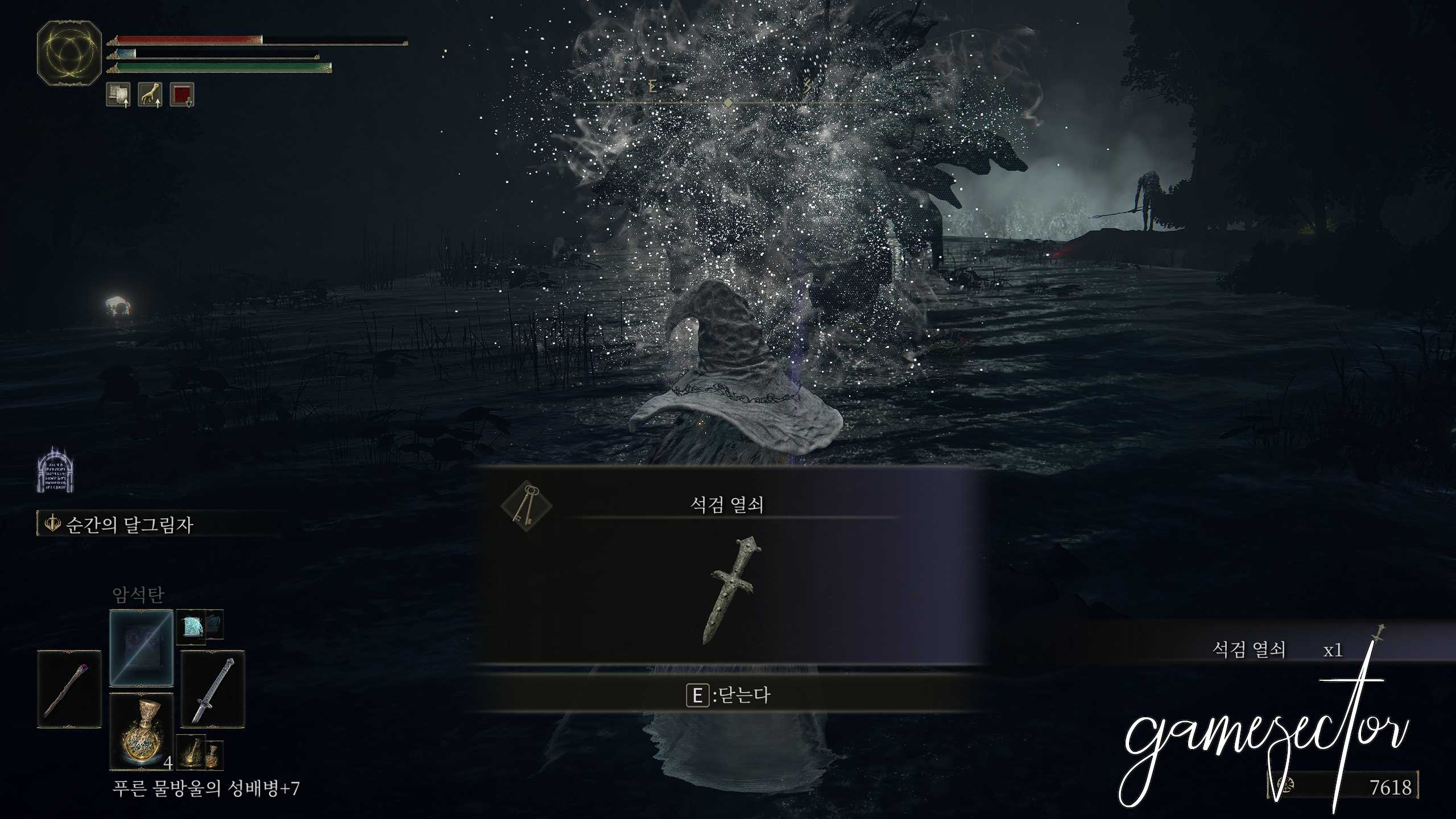 계단을 내려와서 오른쪽으로 가보면 폭포 중앙에 있는 석관과 상호작용하면 숨겨진 보스 암흑의 부산물 에스테르에 접근할 수 있다.