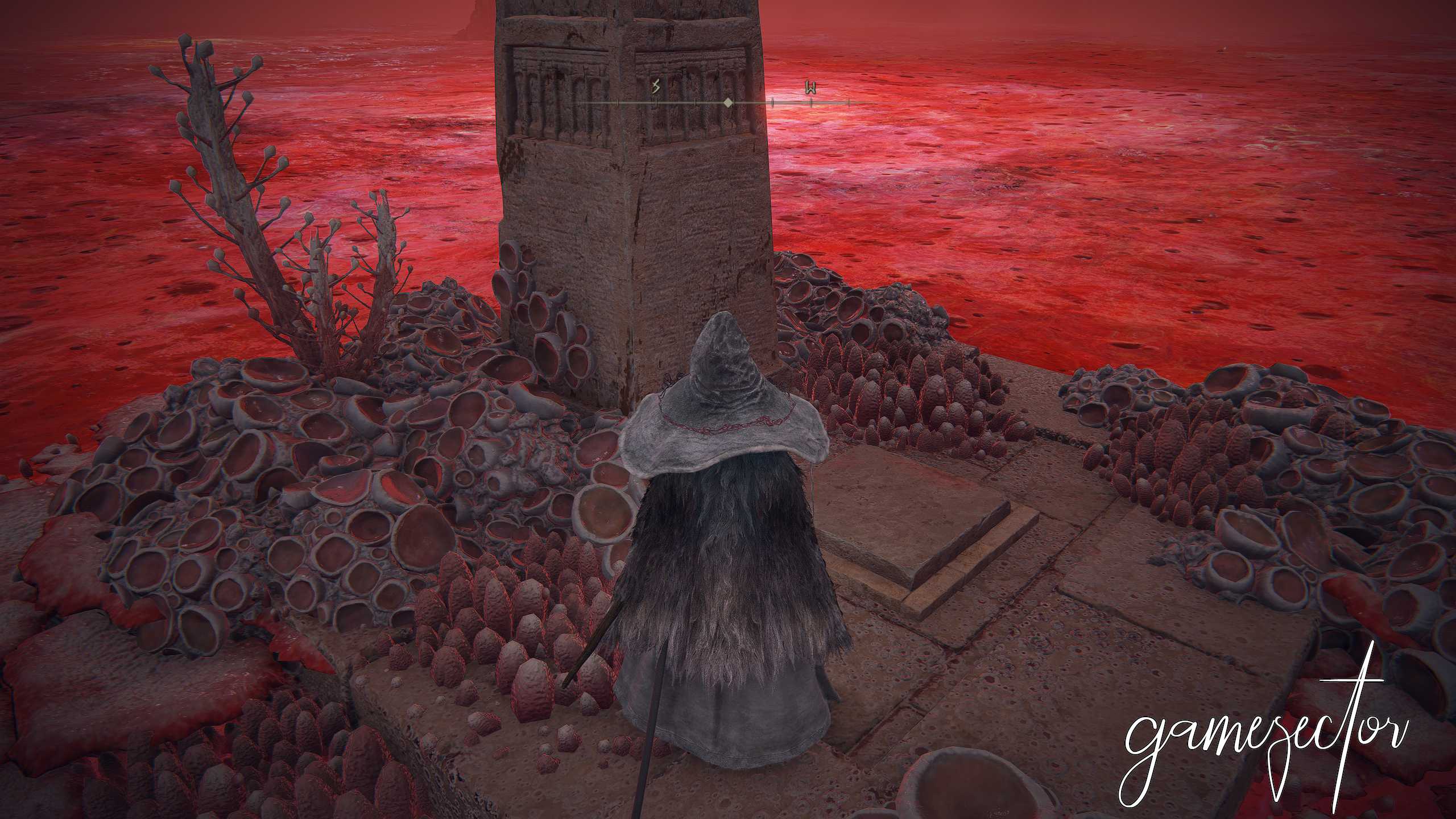 남서쪽에 있는 돌로 된 건축물에 도달하게 되면 왼쪽 계단으로 내려가면 대회랑 축복이 있다. 일단 축복을 활성화하면 기둥을 찾아다니면서 압력판을 밟으면서 위험하면 축복으로 귀환하는 식으로 진행하자.