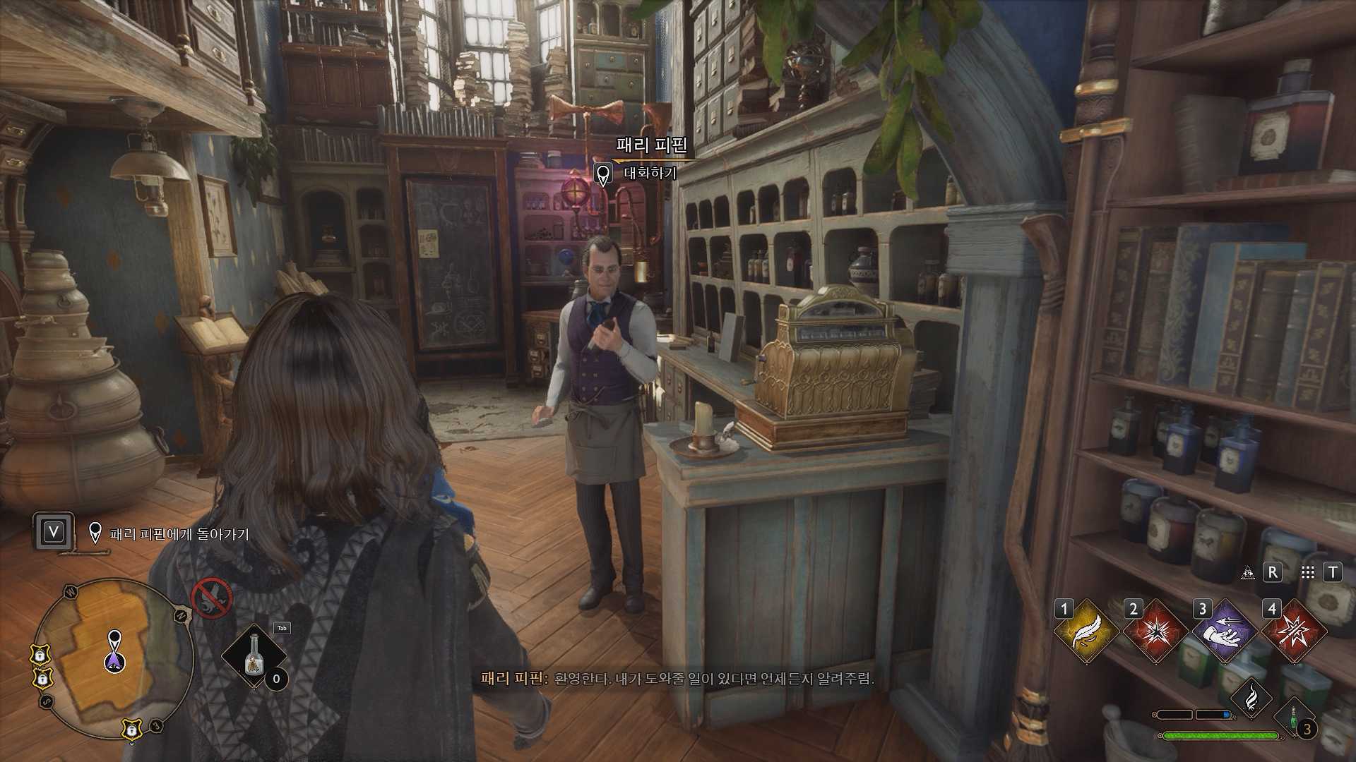 간단한 일을 찾고 있다면 그와 이야기를 해보자. 호그스미드에 있는 J. 피핀의 마법약 상점에 가면 패리 피핀에게 말을 걸면 투명 마법약 4개를 받고 파티마 라왕에게 투명 마법약 3개를 배달해야 된다.