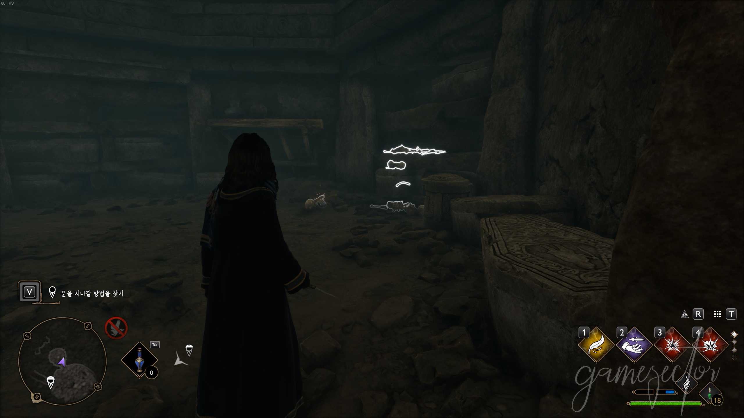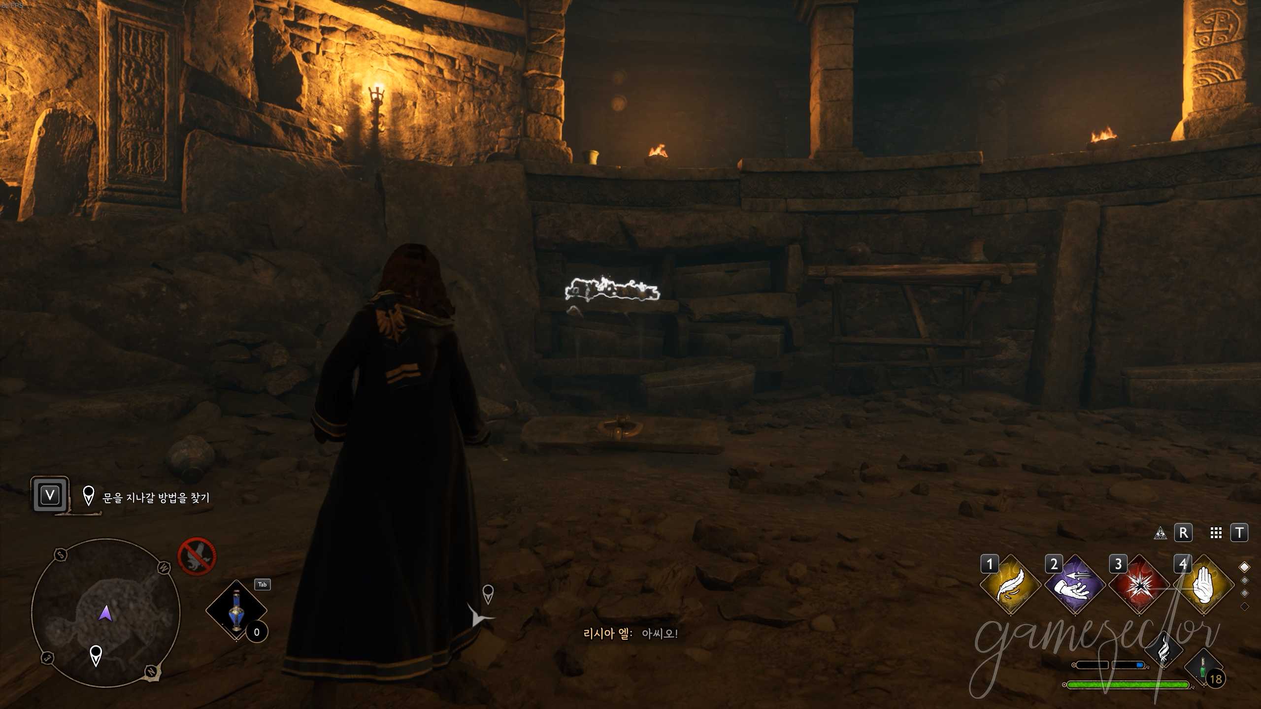 다음 방에서 거미들을 퇴치 후 거미줄을 인센디오 또는 콘프링고로 제거하고 유물에 남겨진 쪽지와 잃어버린 유물 삽화 읽어보자. 세바스찬과 대화에서 어떤 선택을 하더라도 결과는 동일하고 나갈 때 오미니스와 만날 수 있다.
