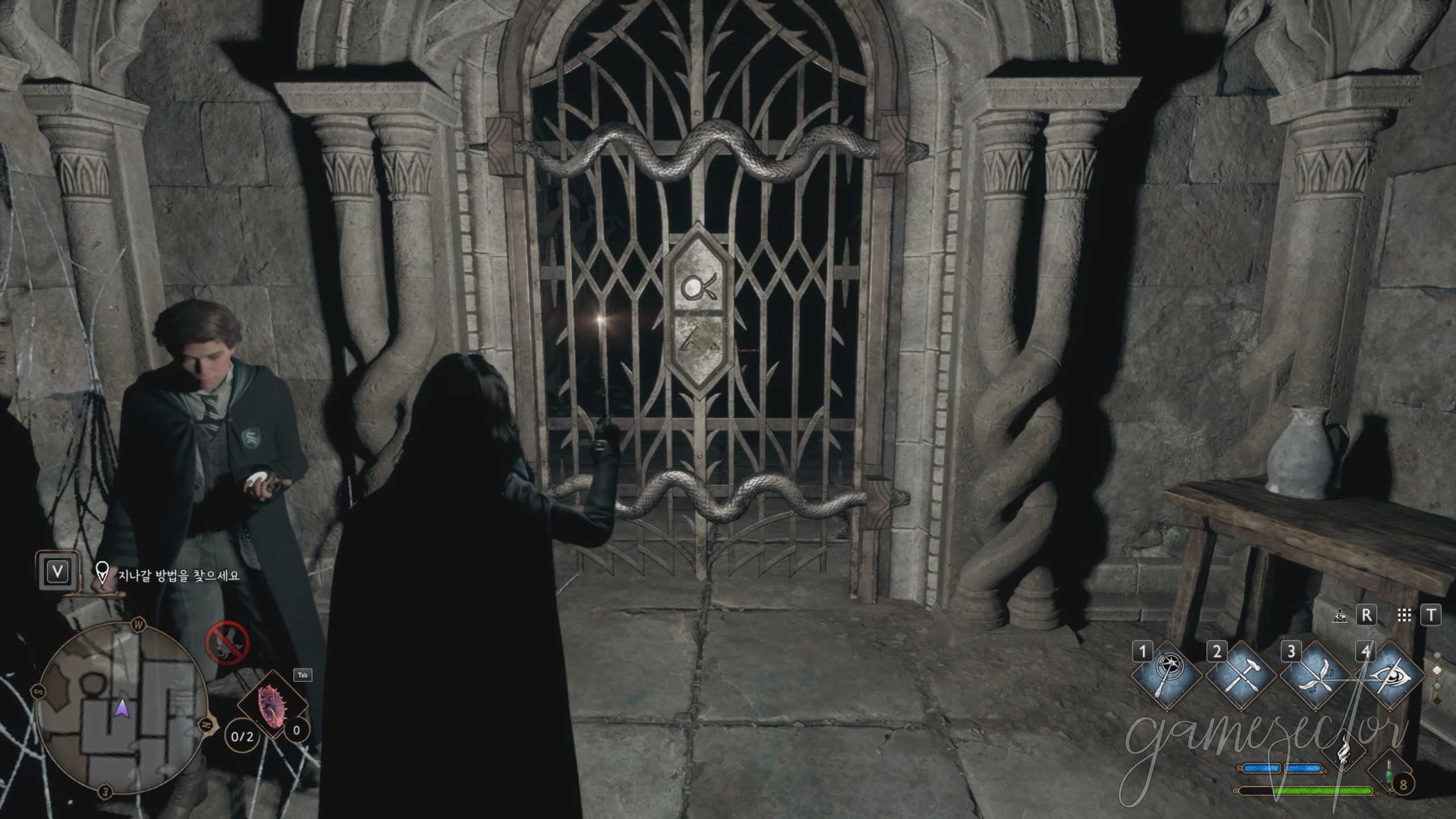 오미니스와 대화를 끝내고 나면 숨겨진 슬리데린의 입구를 열어야 되는데 오미니스가 있는 복도를 따라 2개의 화로가 있고 동쪽 복도를 따라가면 1개가 있다. 빠르게 이 화로들을 콘프링고 주문으로 불을 밝혀준 뒤 문이 열리면 계단을 따라 내려갈 수 있다.