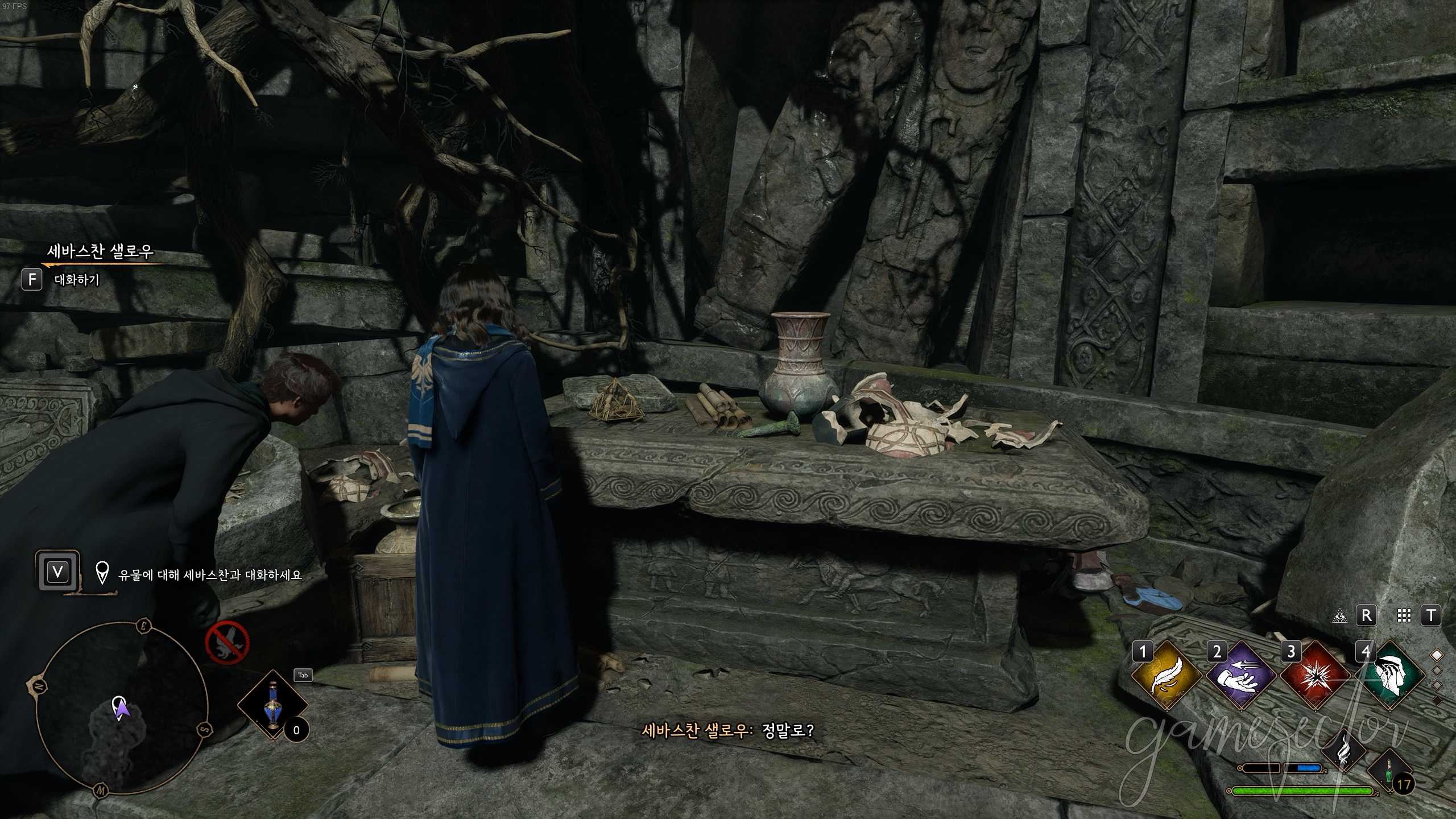 세바스찬이 슬리데린 휴게실 밖에서 없으면 빛나는 원에서 대기하면 나타날 것이다. 대화를 끝내고 오미니스 곤트를 만나러 가자.