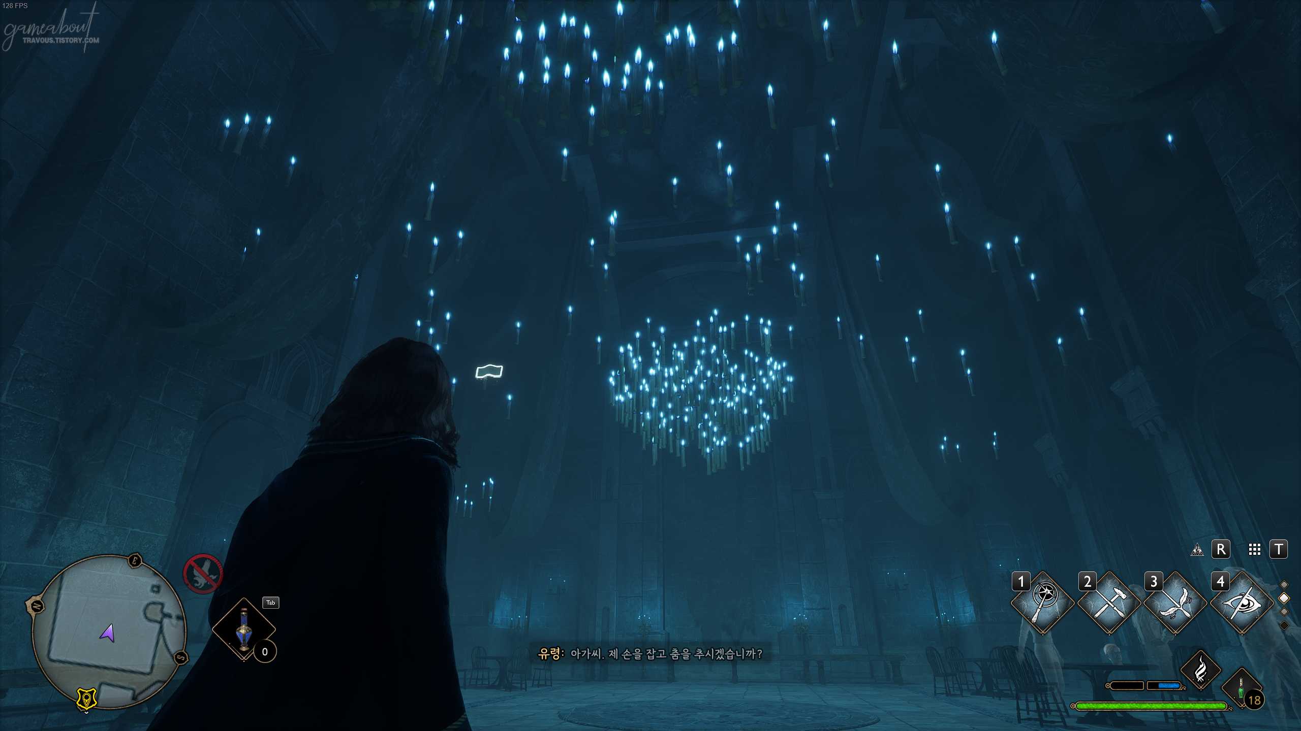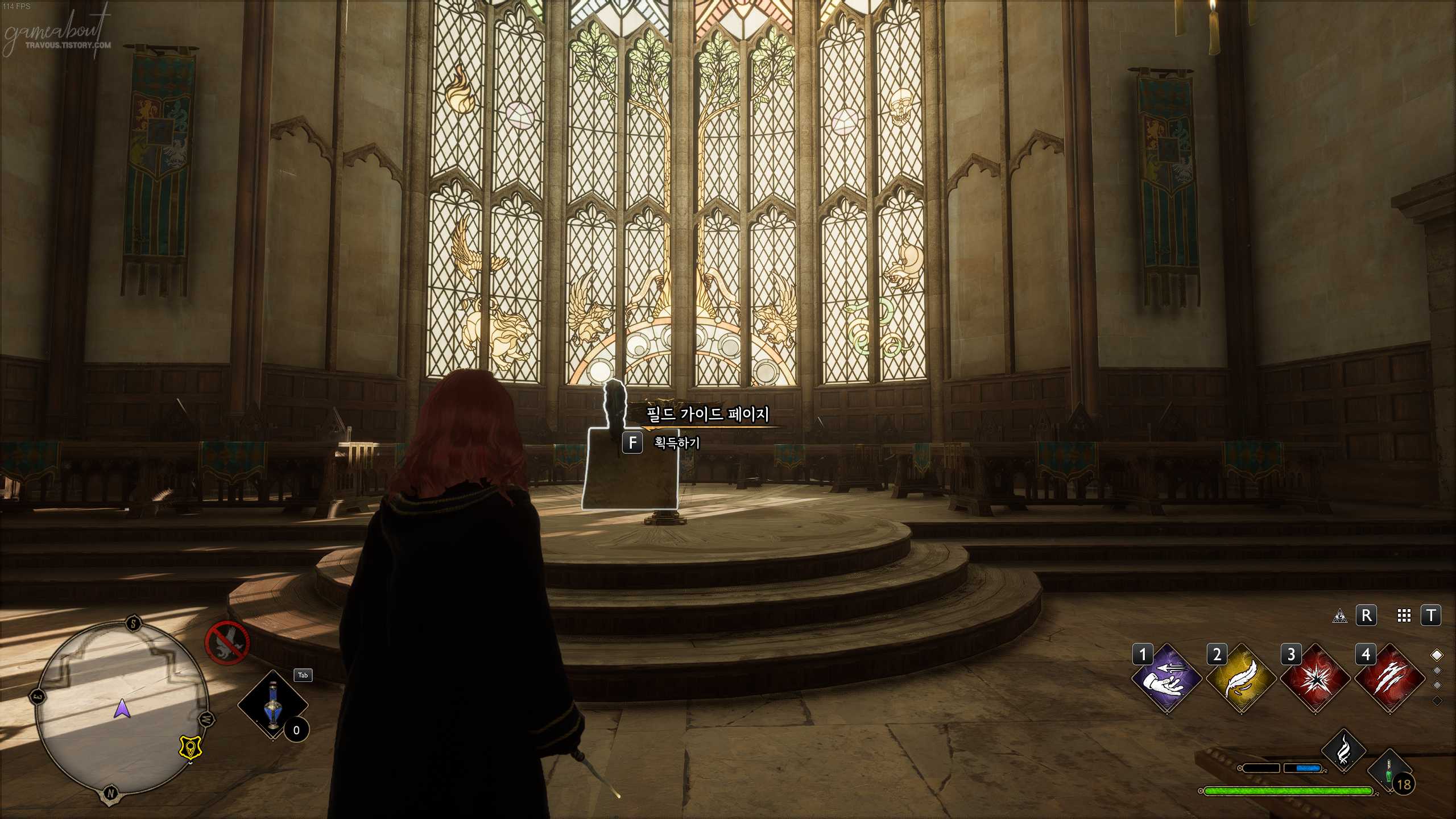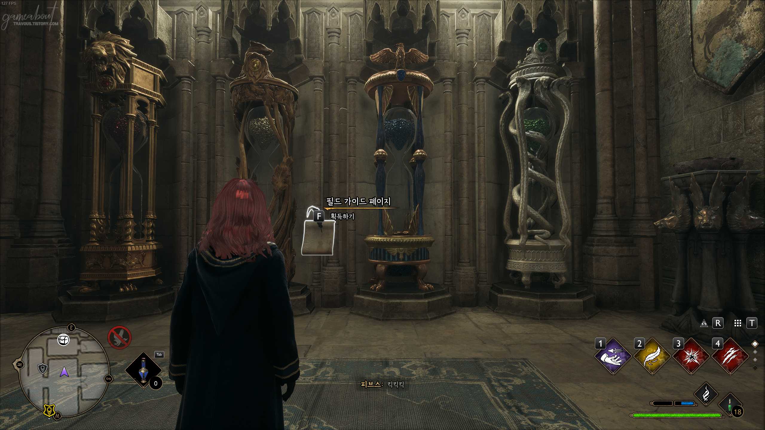 연회장 플루 불꽃에서 왼쪽에 있는 문을 나가면 접견실 북쪽에 대형 문으로 나가자. 현관 복도로 올 수 있는데 천장을 바라보면 날아다니는 페이지를 찾을 수 있다. 아씨오 주문을 사용하면 필드 페이지 가이드를 획득할 수 있다.