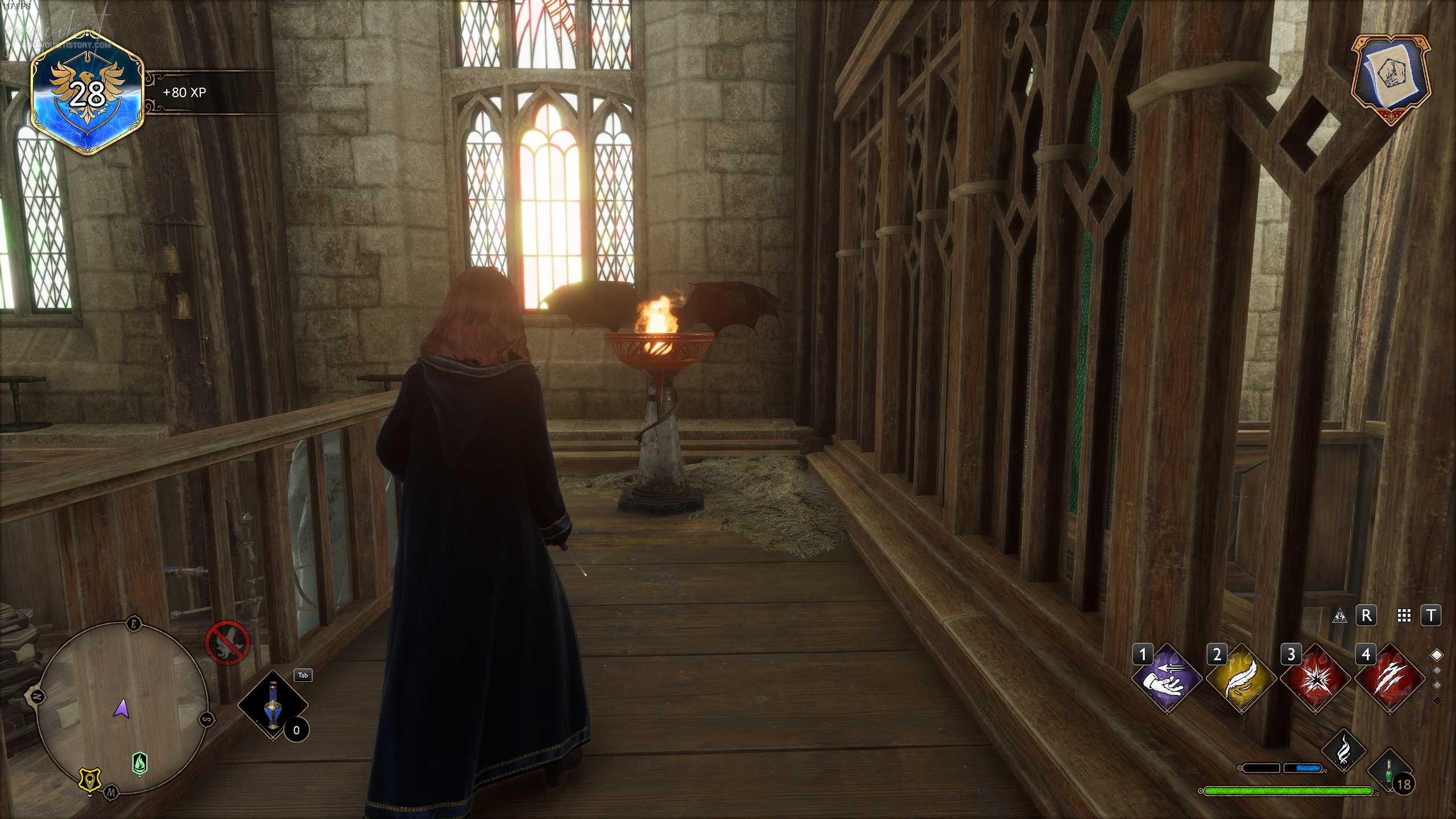 연회장 플루 불꽃으로 이동 후 왼쪽에 있는 계단을 따라 올라가면 방안에 있는 또 다른 계단이 있는데 올라가보면 용의 화로가 있는 곳에 도착할 수 있다. 콘프링고 또는 인센디오 주문을 사용하면 필드 페이지 가이드가 나타난다.