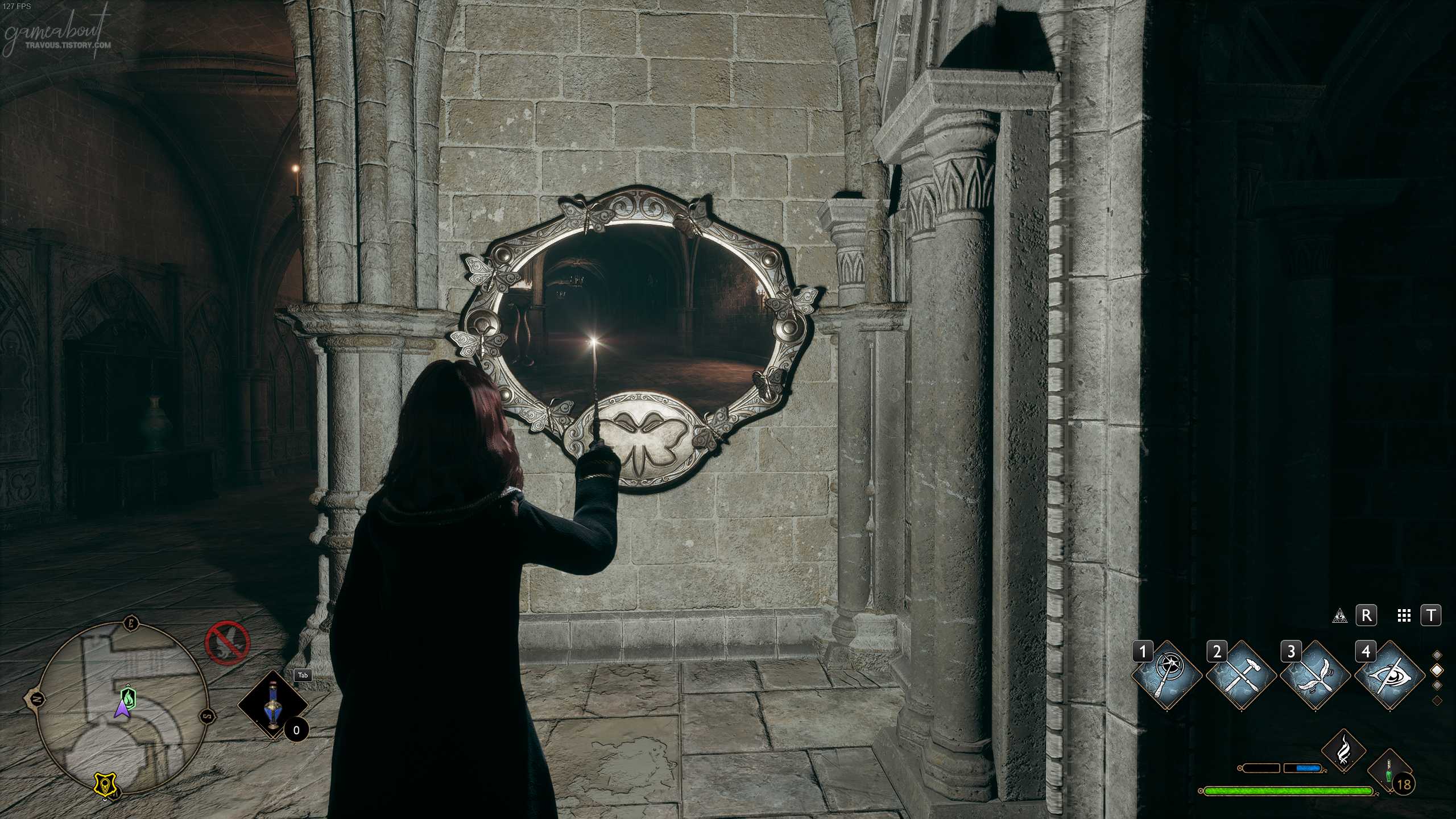 구름다리 안뜰 플루 불꽃에서 북쪽 방향에 있는 지하 항구로 가는 승강기를 지나면 보이는 첫 번째 계단을 올라가면 거울 나방이 있다. 루모스 주문을 사용하고 거울 나방을 활성화 시키자.