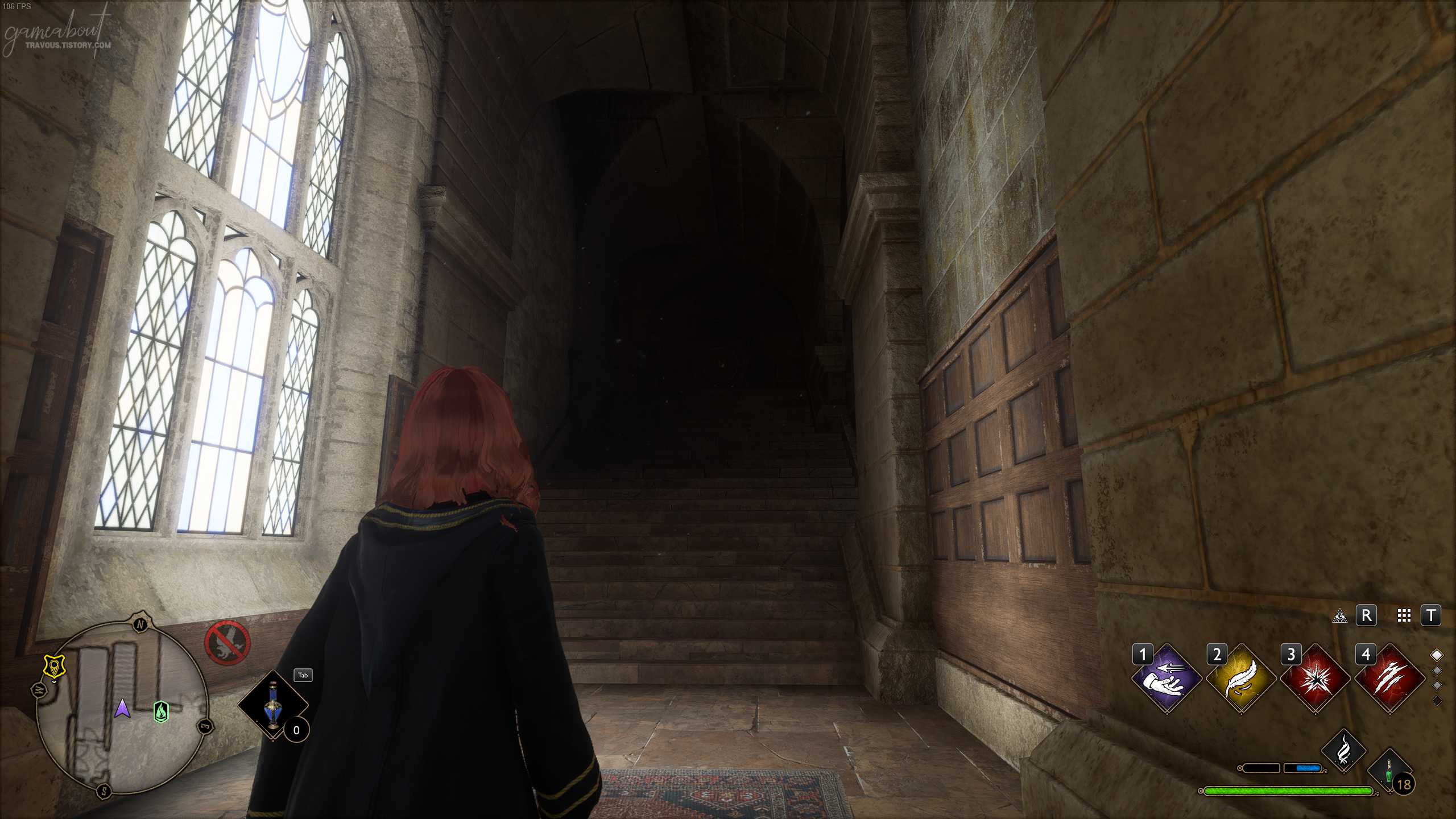 구름다리 안뜰 플루 불꽃에서 북쪽 방향에 있는 지하 항구로 가는 승강기를 지나면 계단이 보이는데 거울 나방이 있던 첫번째 짧은 계단을 지나서 남은 계단을 올라가자.