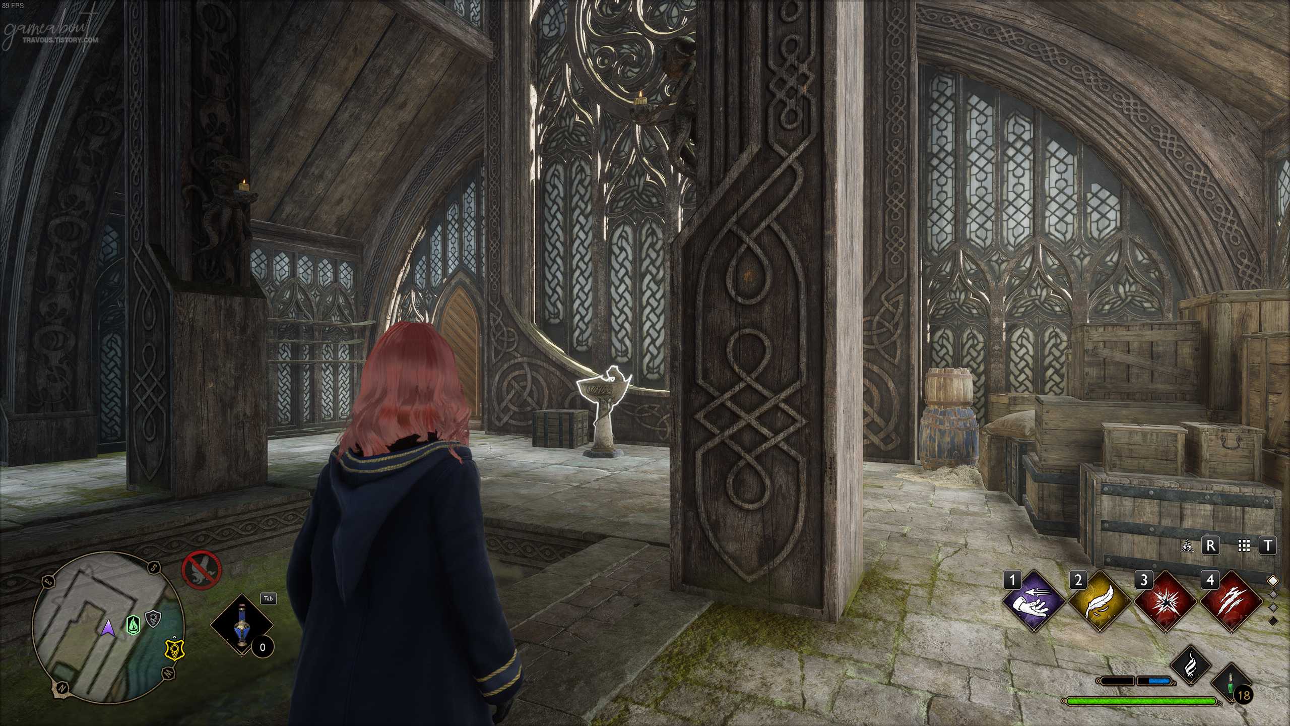 중앙 계단 플루 불꽃에서 동쪽에 있는 나선형 계단을 내려가면 '배 간지럽히기' 상호작용할 수 있는 과일 그림이 그려진 액자가 있다. 가까이가서 레벨리오 주문을 사용하면 필드 가이드 페이지를 찾을 수 있다.