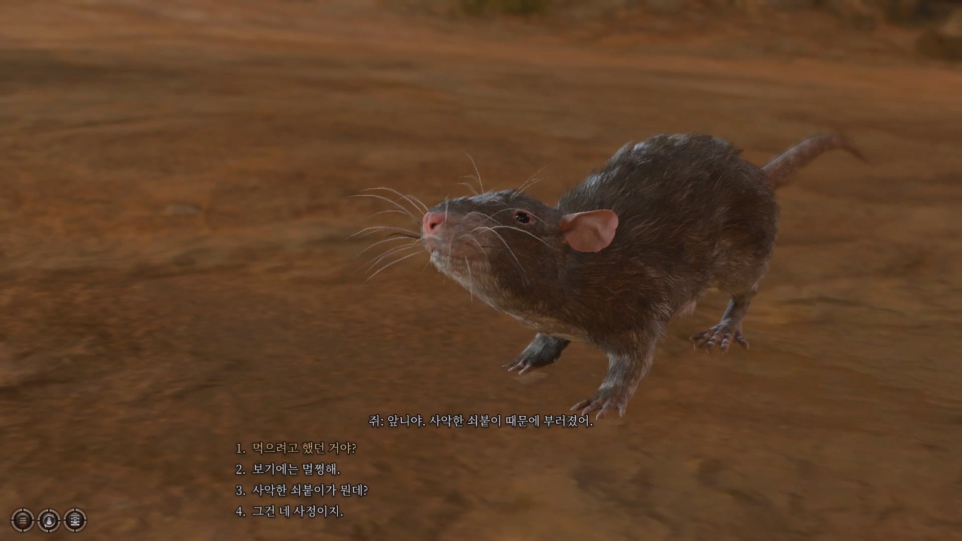 동굴에 있는 창고(X:194 Y:575) 근처에서 쥐를 발견할 수 있는데 동물과 대화를 통해 말을 걸어보면 사악한 쇠붙이 때문에 앞니가 부러져 괴로워하는 것을 볼 수 있다.