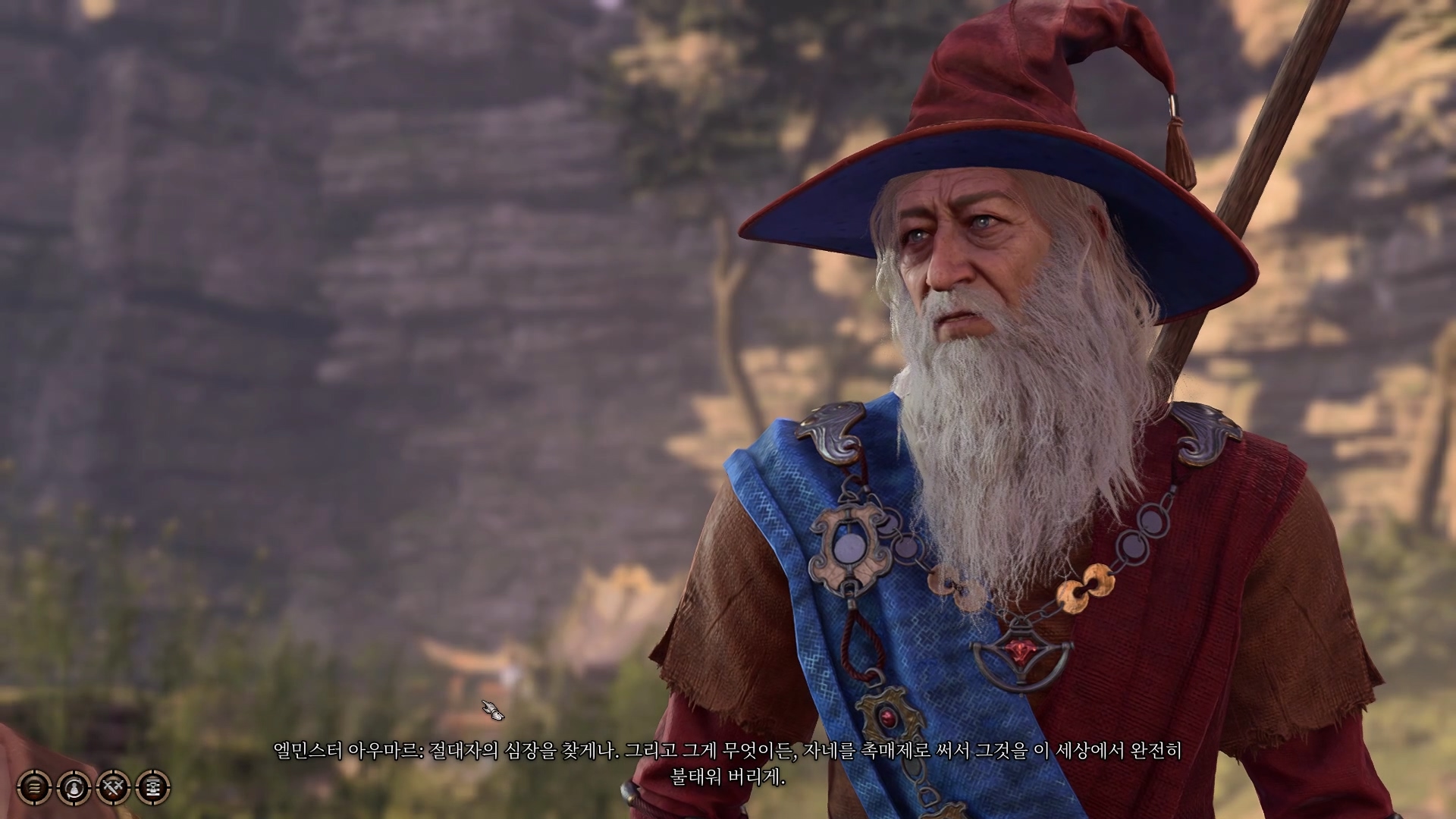 - 위대한 위저드 엘민스터를 만났다. 위저드는 오랜 여행으로 녹초가 되어 있었다. 긴급한 문제로 게일과 할 얘기가 있다고 한다. 나중에 야영지에서 무슨 일인지 물어봐야 겠다.