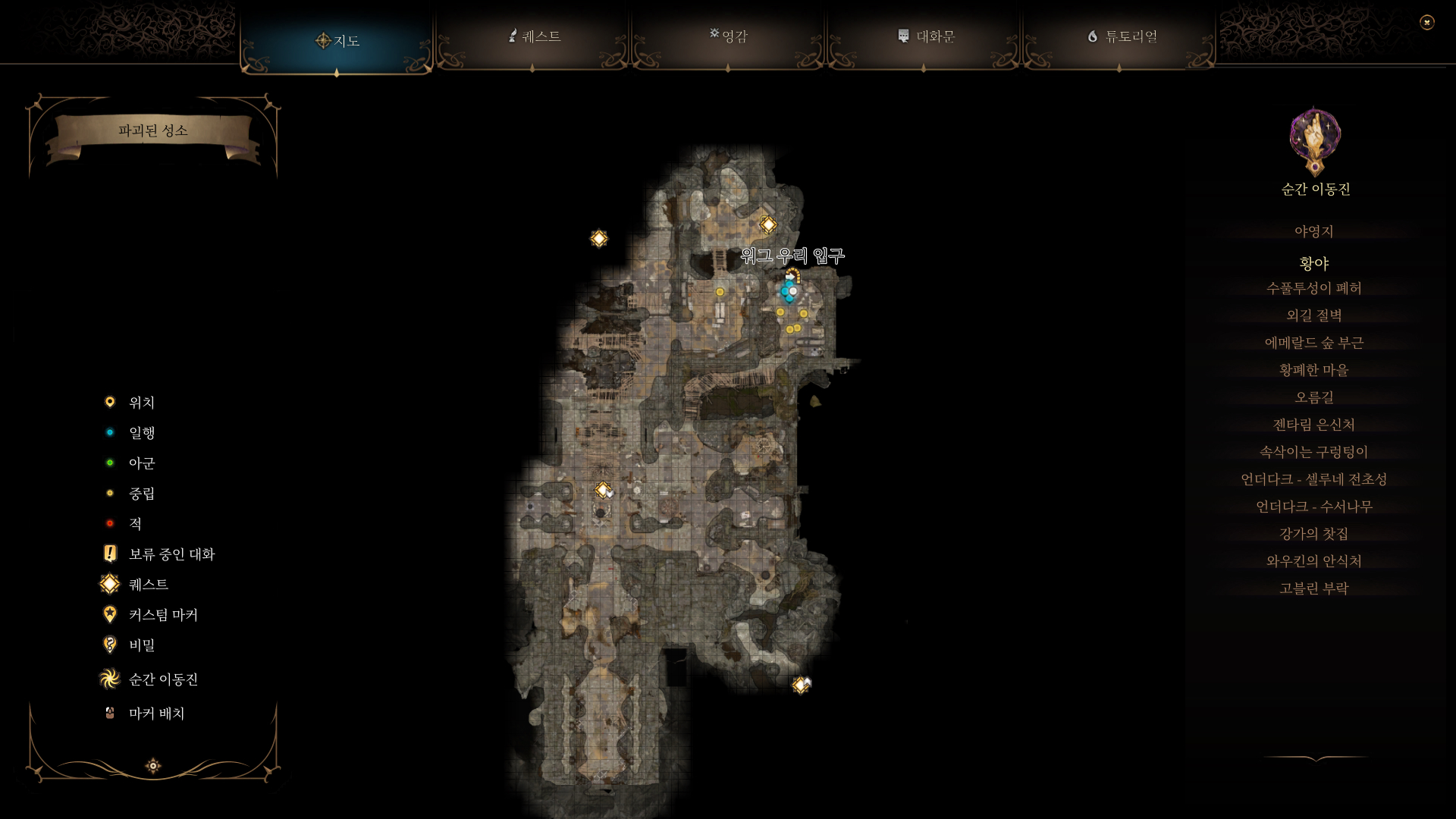 고블린 부락에 조용히 다니기 위해서는 고블린 사차 구하기 퀘스트를 완료하거나 드로우로 변장 후 다니면 된다. 고블린 부락 북쪽에 위치한 파괴된 성소에 들어가서 워그 우리 입구로 들어가자.
