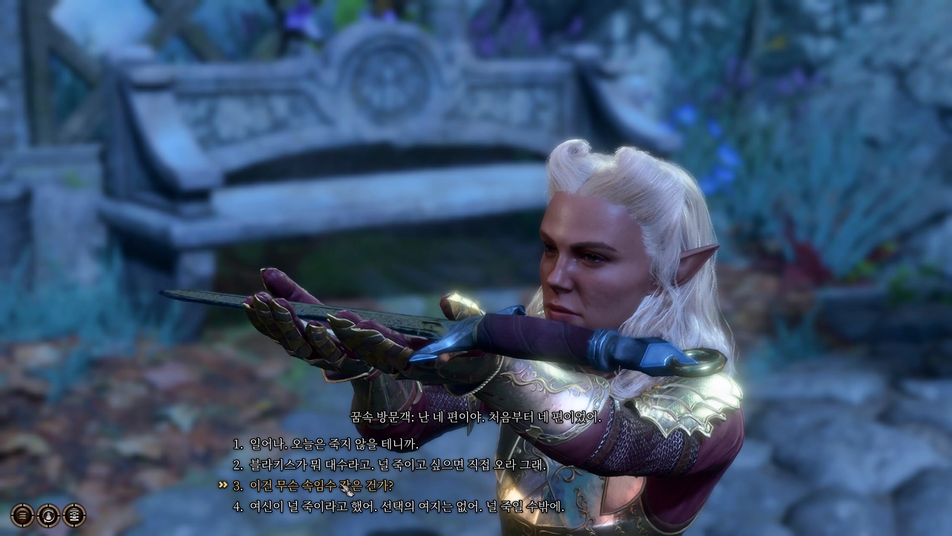 대화 선택에 따라 그녀를 죽이려 한다면 그녀와 신뢰가 금이 가기 시작하고 대화에서 적대심을 느낄 수 있다. 반대로 그녀를 살려주는 선택을 한다면 블라키스가 그녀를 죽이려는 이유와 비밀을 알 수 있다.