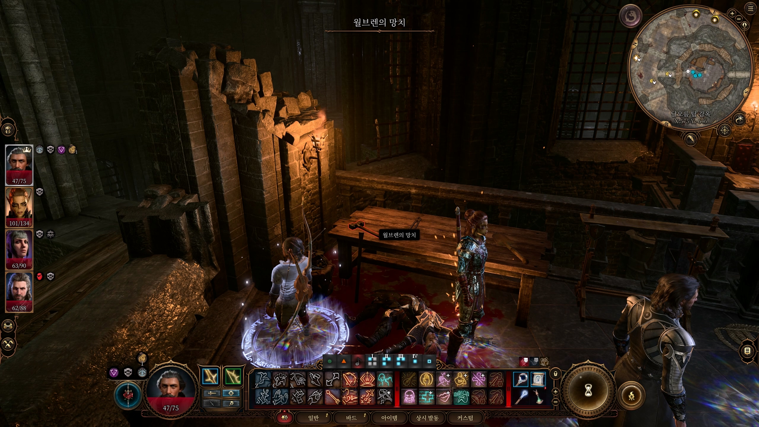 2층에 있는 감시자를 처치하면 전리품으로 높은 등급의 주문 생명 애뮬릿을 얻을 수 있다. 그 외에도 감옥 열쇠, 달오름 탑 경비의 열쇠를 전리품으로 획득할 수 있다. 월브렌의 망치(X:575 Y:-650)는 2층 책상 위에 있다.