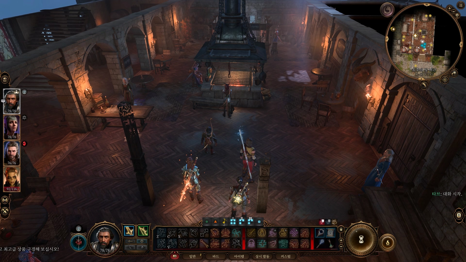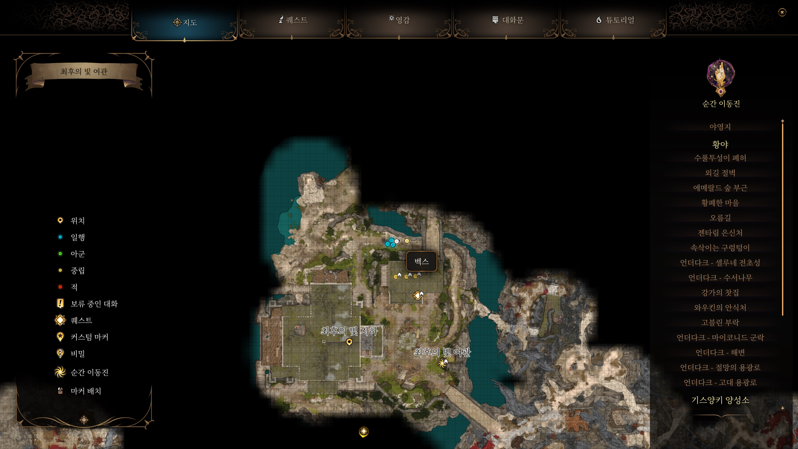 최후의 빛 여관 중앙에 서 있는 세리스(X:-63, Y:145)와 대화하기.