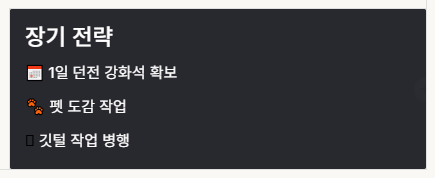 - 장기 전략: 1일 던전으로 강화석을 꾸준히 확보하며, 펫 도감/깃털 작 등 내실 작업을 병행합니다.