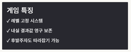 - 게임 특징: 레벨 고정, 내실 결과값 영구 보존.
