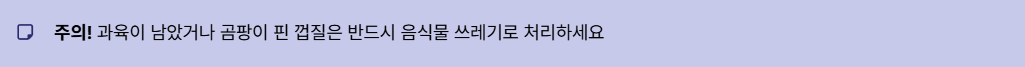 주의사항: 껍질 외에 과육이 남아있거나 곰팡이가 핀 껍질은 수분 함량이 높아 반드시 음식물 쓰레기로 처리해야 합니다.