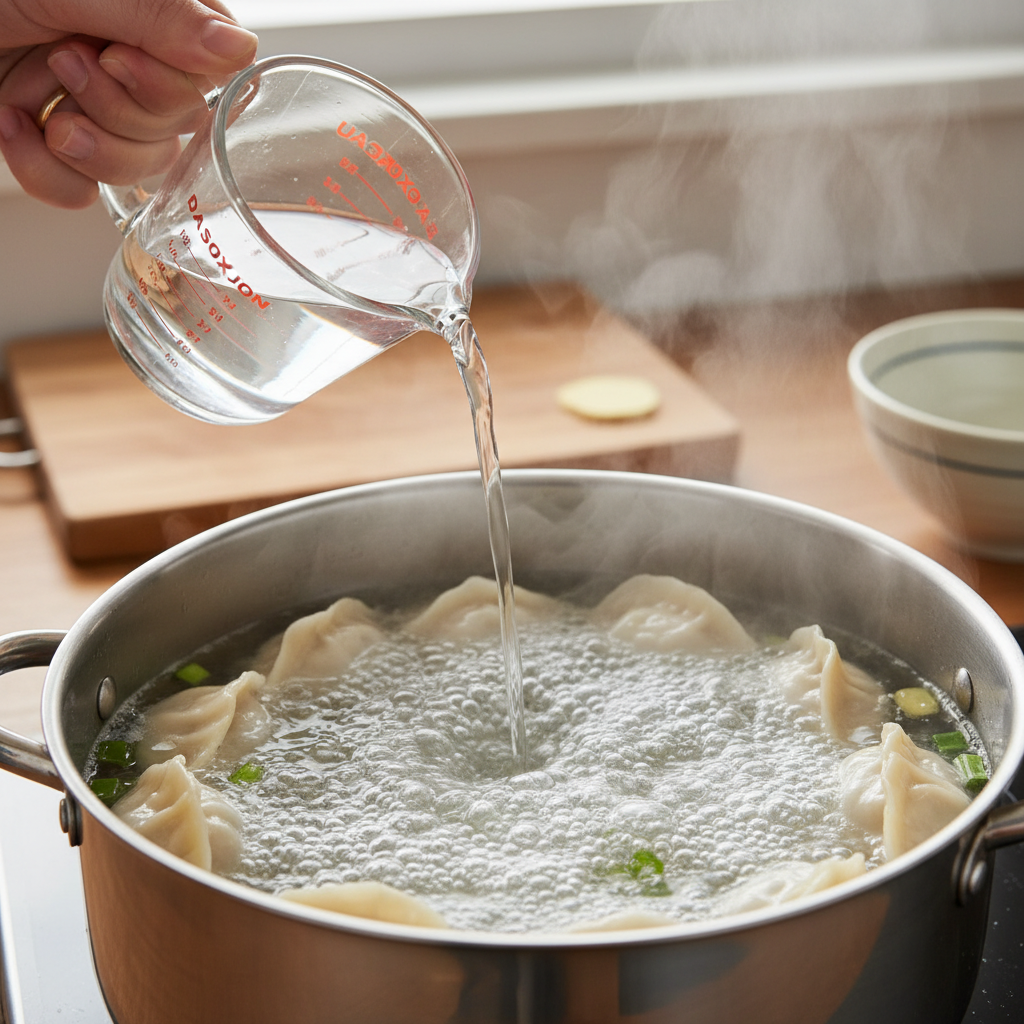 물이 다시 팔팔 끓기 시작하면 **찬물(1/2 컵 정도)**을 한 번 부어주는 것이 핵심 비법입니다. 이 과정은 만두피가 불어 터지는 것을 막아줍니다.