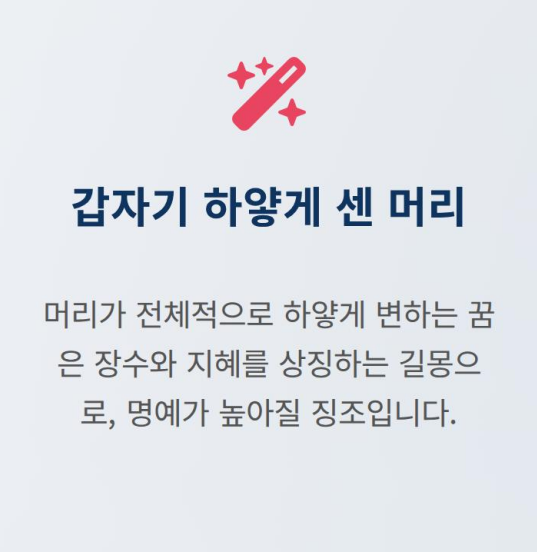 머리카락이 갑자기 하얗게 변하는 꿈은 보통 장수나 지혜를 상징하는 길몽입니다. 하지만 흰 머리가 보기 싫게 듬성듬성 있다면 걱정거리가 늘어날 징조일 수 있습니다.