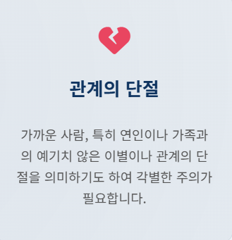 특히 가까운 사람과의 관계에서 갈등이 생기거나, 직장이나 조직에서 불명예스러운 일을 당할 수 있으니 조심해야 합니다. 예기치 않은 이별이나 단절을 의미하기도 합니다.