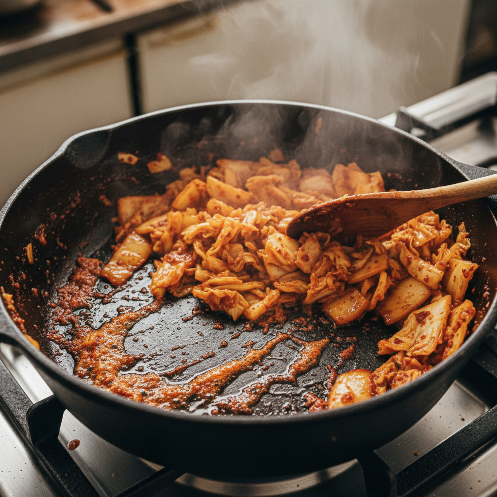 ✔ 볶음: 참치 기름에 김치와 고춧가루 볶기 (고추기름 효과)