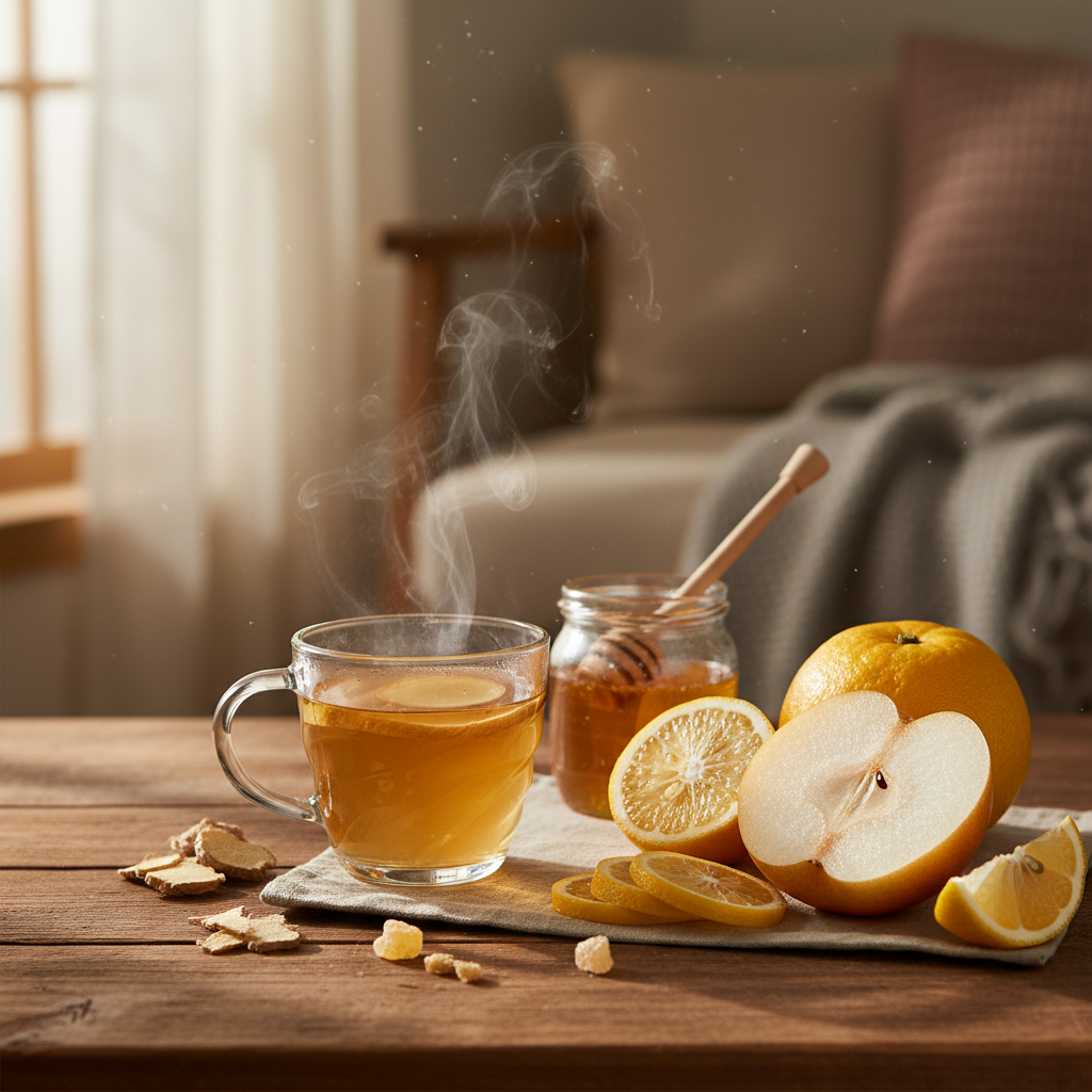 목이 칼칼하고 가래가 끓을 때는 배만 한 것이 없습니다. 배에 풍부한 '루테올린' 성분은 기관지 염증을 가라앉히고 점막을 촉촉하게 만들어 기침을 멎게 합니다.