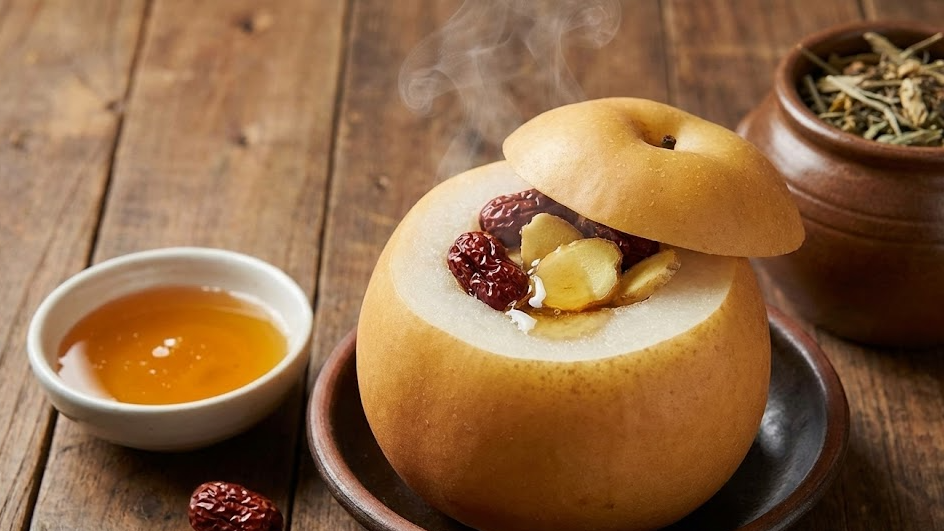 배의 속을 파내고 꿀과 도라지를 넣어 푹 찐 '배숙(배꿀찜)'은 천연 기침약이라 불릴 정도로 효과가 뛰어납니다. 열을 가하면 유효 성분의 흡수율이 더욱 높아집니다.