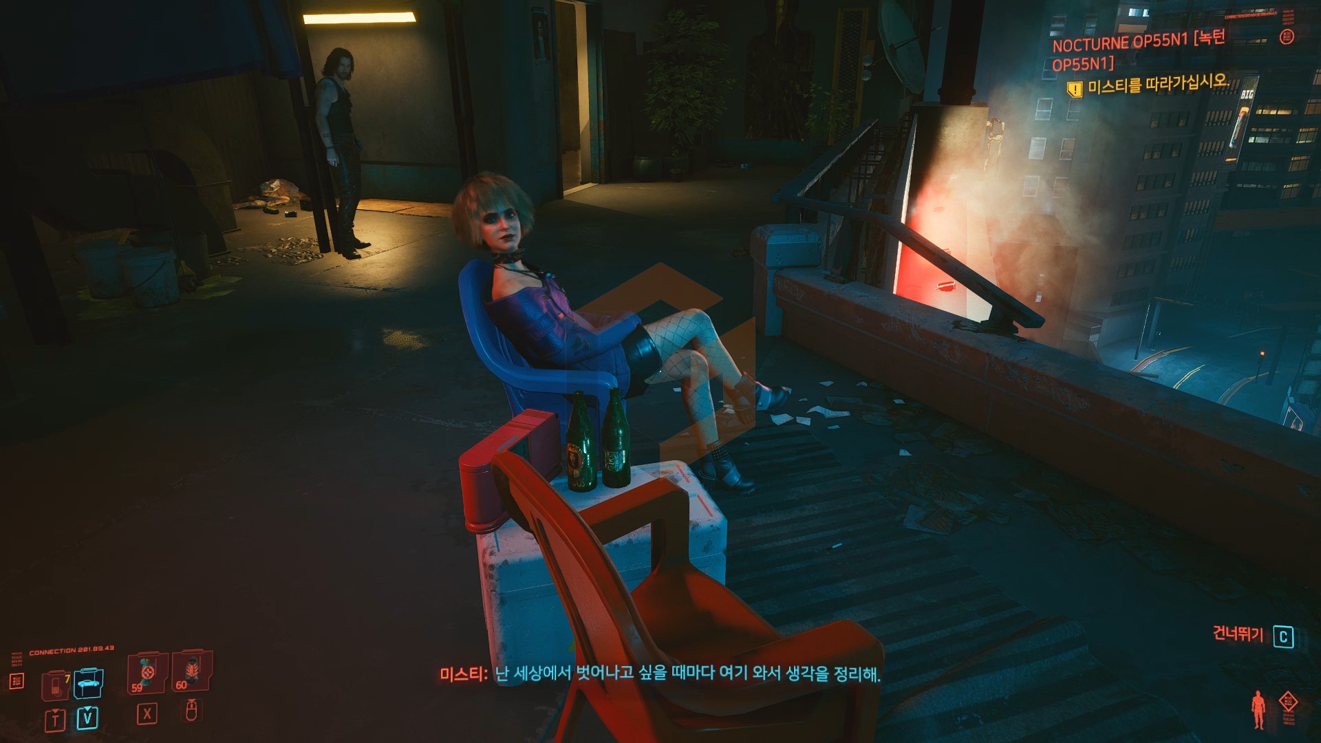 녹턴 OP55N1 수행 중에 미스티가 안내한 옥상에서 아라사카에게 걸어보는 것도 괜찮을 것 같아를 선택 시 진행 할 수 있는 기본 적인 엔딩 중 하나이다. 알약을 먹고나면 조니와 짧은 대화를 끝내