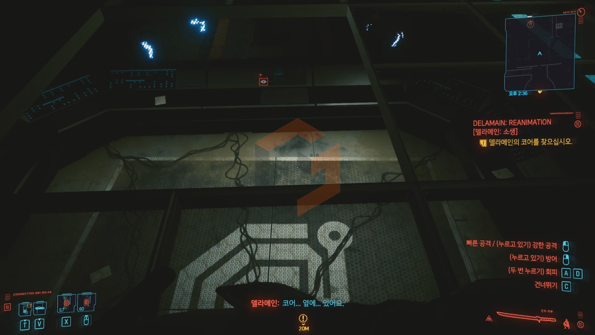 격납고에는 여러 인격체의 델라 메인들이 있는데 피하면서 반대편에 보이는 계단 위로 사무실이 보인다. 굳이 사무실에 들어갈 필요는 없고 사무실 문 옆에 커다란 파이프를 타고 가면 막힌 곳에 도달할 수 있다.
