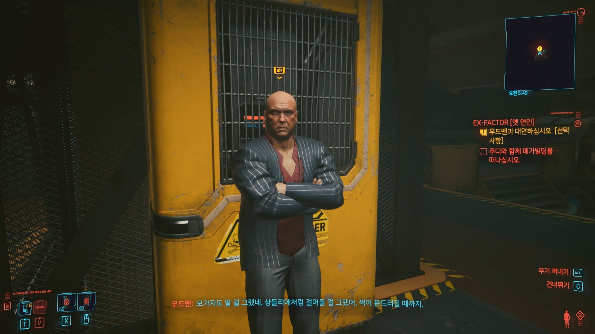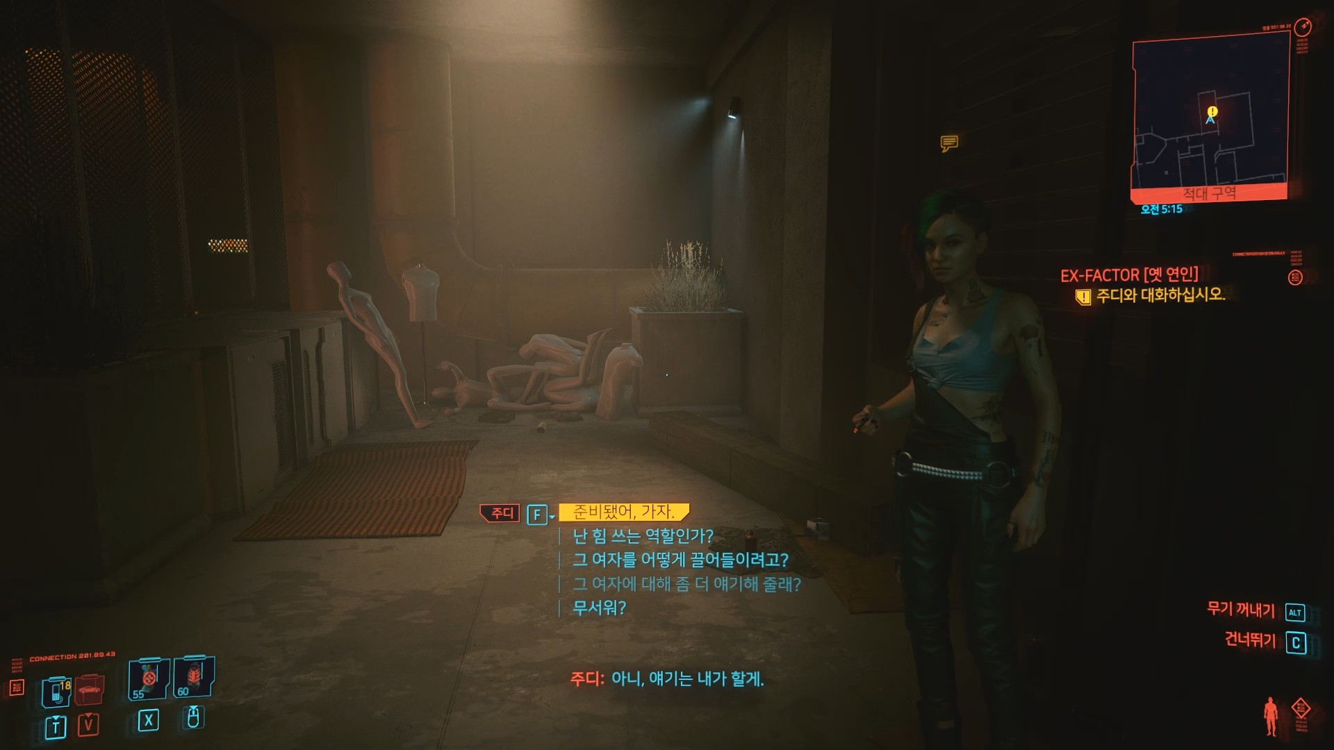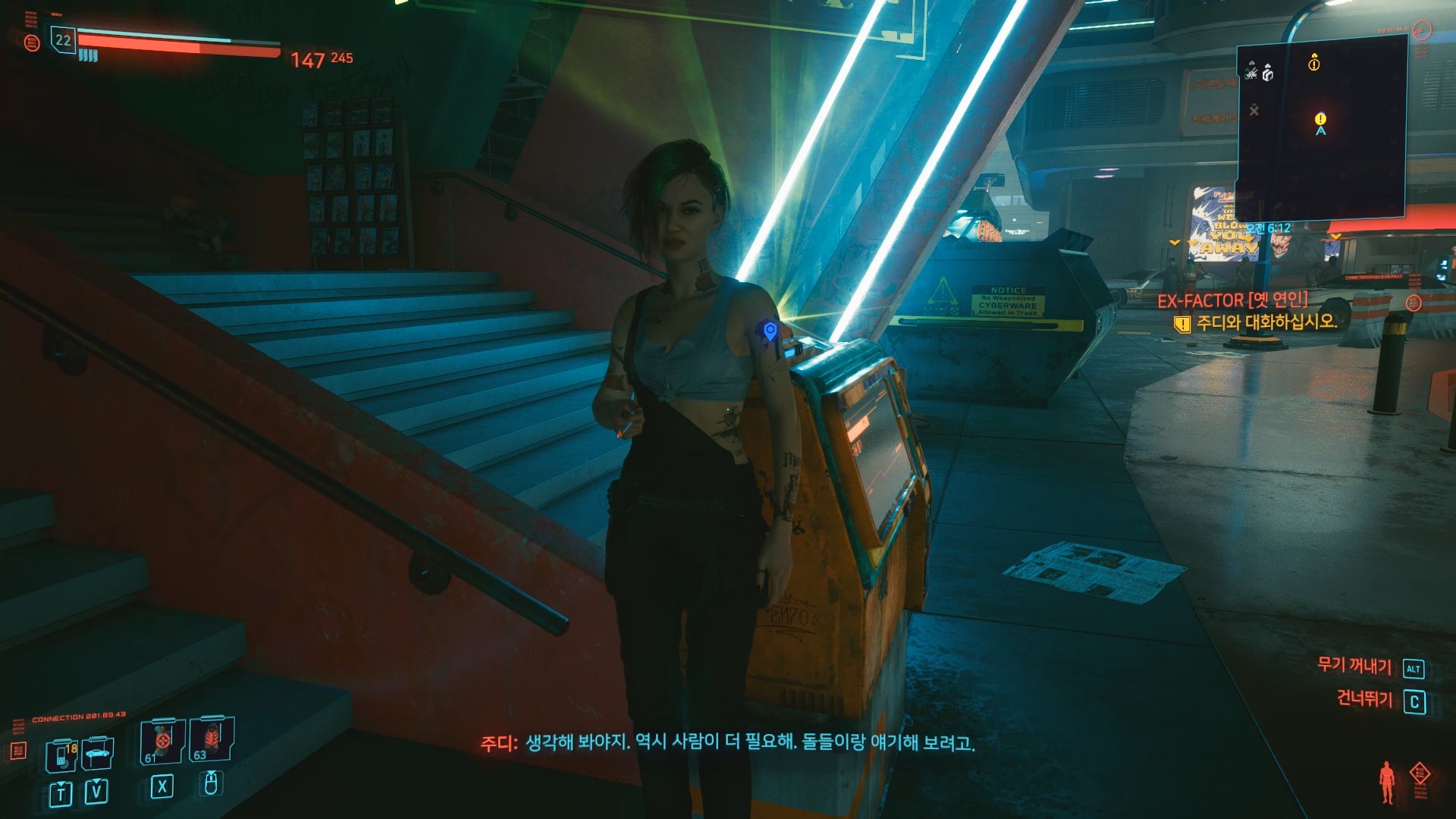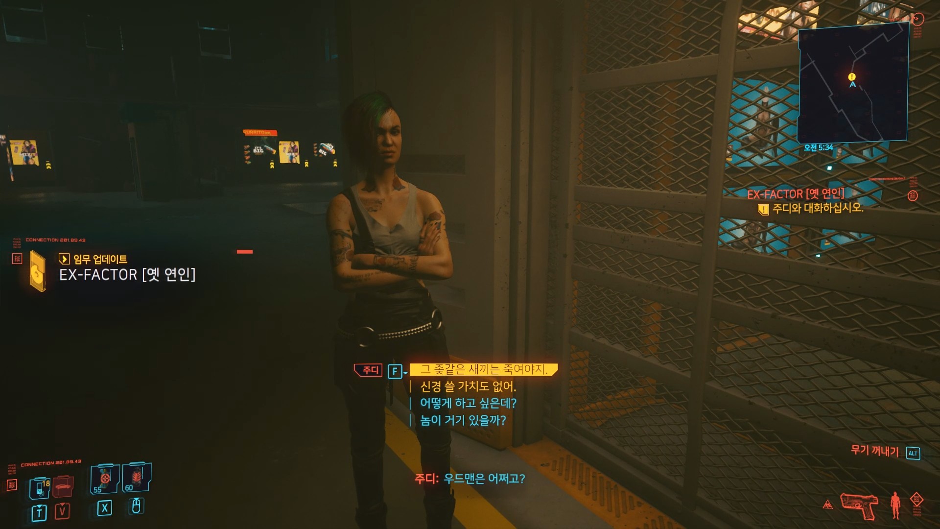 사이버 펑크 2077 이중생활 (DOUBLE LIFE) 사이버 펑크 2077 무질서 (DISORDER) 무질서 (DISORDER) 무의식적인 사랑과 이어지는 주요 임무인 무질서는 미지의 쾌락 이후 주디와 대화를 시작으로 진행된다. 핑