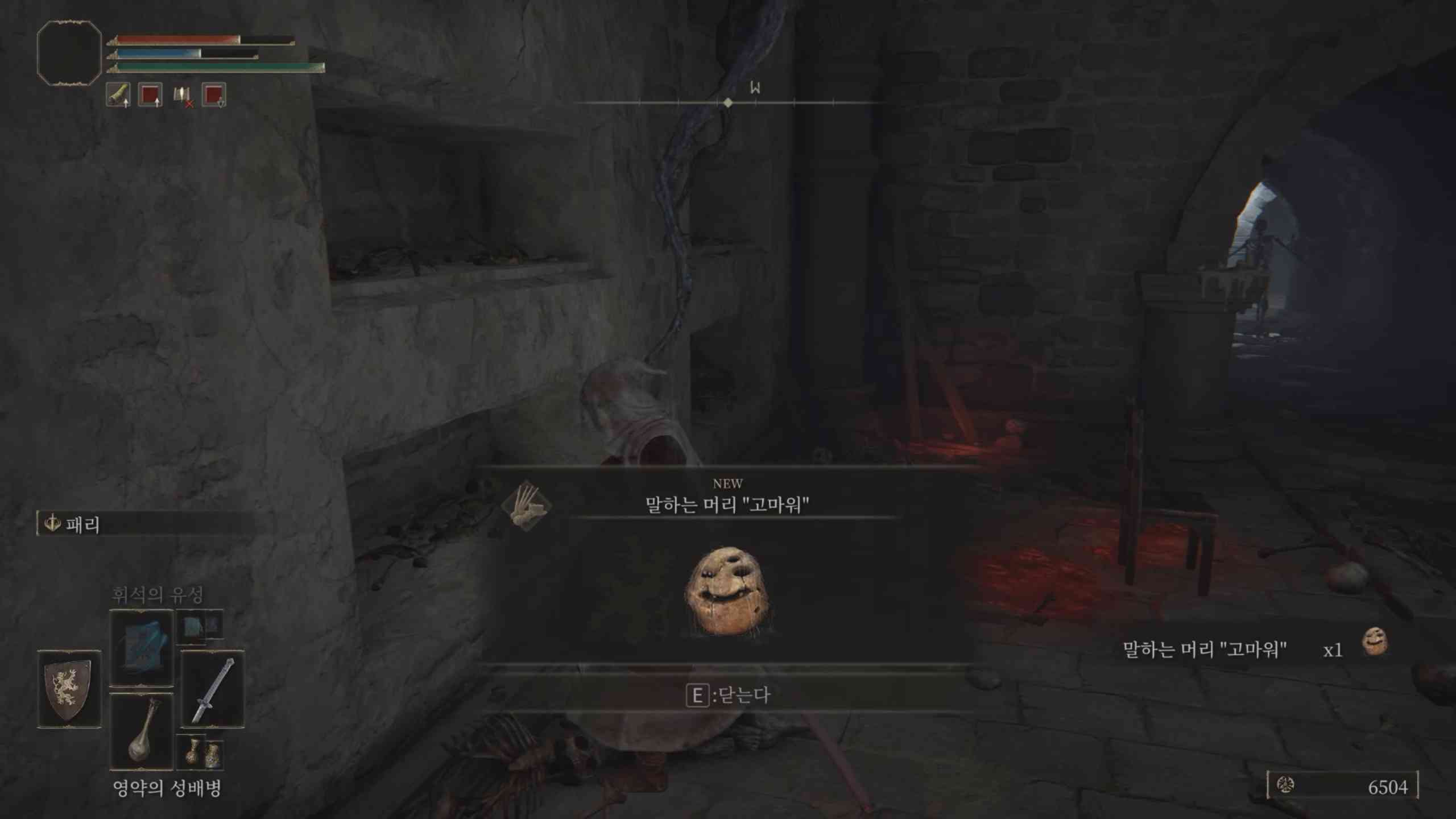 올라가기 전에 왼쪽 방에 있는 사체를 조사하면 말하는 머리 "고마워"를 얻을 수 있다.