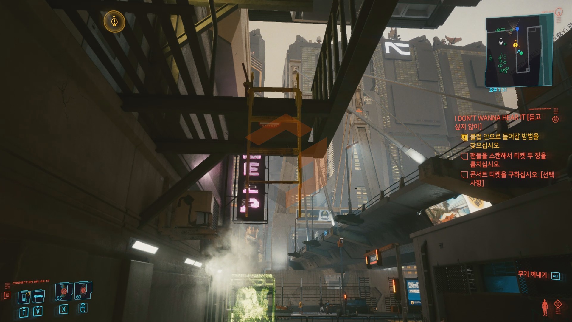 이제 사다리를 타고 위로 올라가야하는데 사다리를 총으로 한발 쏘면 사다리가 내려온다. 클럽안으로 입장하게 되면 문을 지키고 있는 클럽 경비를 만날 수 있는데 테크니컬 9레벨 이상이라면 대화를 통해 무대 뒤로 이동할 수 있다.